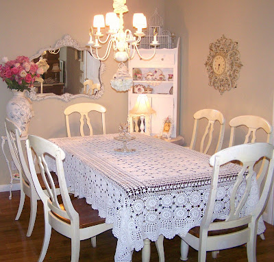 This is a current picture of my dining room! I added the clock on the wall that I got for $5 from my wonderful friend Lorena. The cabinet in the corner I flipped upside down and spruced up with some white paint and added the shabby knobs! My chandelier was a garage sale find that I painted a creamy white and added the handmade rose kissing ball. I still need to complete the shades and add more drippy crystals.
